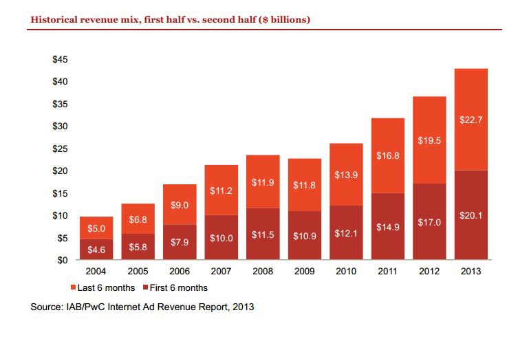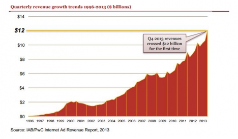 Впервые бюджеты в онлайне превысили расходы рекламодателей на ТВ. В 2013 году выручка от телевизионной рекламы составила 40,2 млрд долларов. Президент IAB Рэндалл Ротенберг не видит в этом ничего удивительного. По его словам, цифровые устройства давно доказали свою эффективность в привлечении и охвате аудитории. С