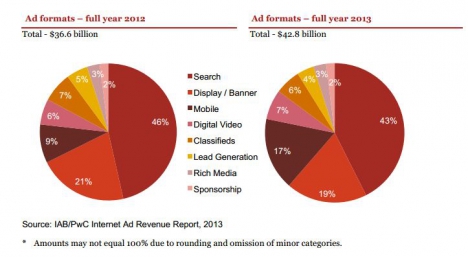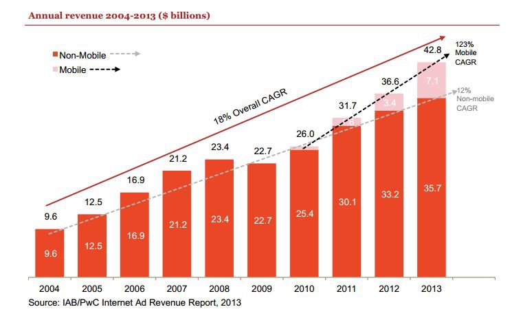 Американский рынок интернет-рекламы установил новый рекорд — по итогам 2013 года инвестиции в new media составили 42,8 млрд долларов. Прирост в данном сегменте составил 17%, тогда как мобильная реклама показала трехзначный рост (+110%), говорится в отчете Interactive Advertising Bureau и PricewaterhouseCoopers.