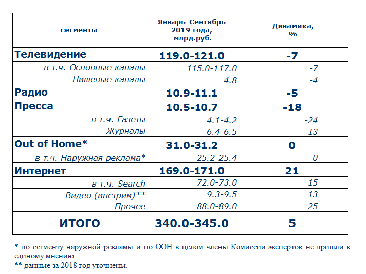 Наконец, про ООН и про наружную рекламу. Впервые за многие годы члены комиссии экспертов не смогли прийти к единому мнению о динамике сегмента. Отчасти это связано с некоторыми изменениями в составе рабочей группы комиссии, но в большей степени с изменениями на самом рынке, где активно развивается подсегмент digital-OOH, который мы пока не научились достаточно корректно измерять. Но ничего страшного в этом мы не видим. Это обычный рабочий момент, и через какое-то время проблема будет снята.