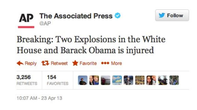 В Twitter-ленте AP накануне стали публиковаться сообщения о взрыве в Белом доме и ранении президента США Барака Обамы. Это вызвало панику на американском фондовом рынке, так как брокеры привыкли получать информацию из микроблога.