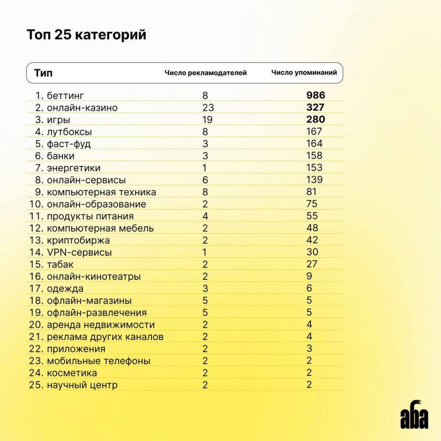 Наиболее упоминаемыми категориями в АБА назвали беттинг (8 рекламодателей; 986 упоминаний), онлайн-казино (23 рекламодателя; 327 упоминаний), игры (19 рекламодателей; 280 упоминаний).