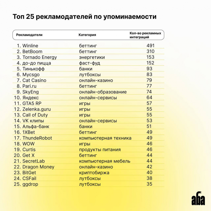 Самыми упоминаемыми рекламодателями стали букмекерские конторы Winline (491 рекламная интеграция) и BetBoom (310). На третьем месте — бренд энергетиков Tornado Energy — 153 рекламные интеграции. В первую десятку также попали «Додо пицца» (152 рекламные интеграции), «Тинькофф» (93), Mycsgo (83), «Яндекс» (64).