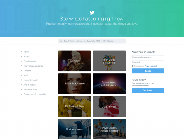 Twitter изменил дизайн главной страницы; теперь миллионы твитов на актуальные темы могут увидеть и незарегистрированные пользователи. Для их привлечения в соцсеть разработчики распределили все вирусные новости по категориям: «Поп-звезды», «ТВ-шоу и звезды», «Бизнес-новости» и «Милые животные».