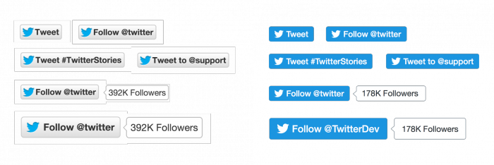 Соцсеть Twitter решила провести частичный редизайн интерфейса. В следующем месяце кнопки Tweet и Follow, предназначенные для установки на сторонних сайтах, будут выглядеть по-другому: белый цвет иконок изменится на «контрастный» голубой, а цвет шрифта поменяется с черного на белый.