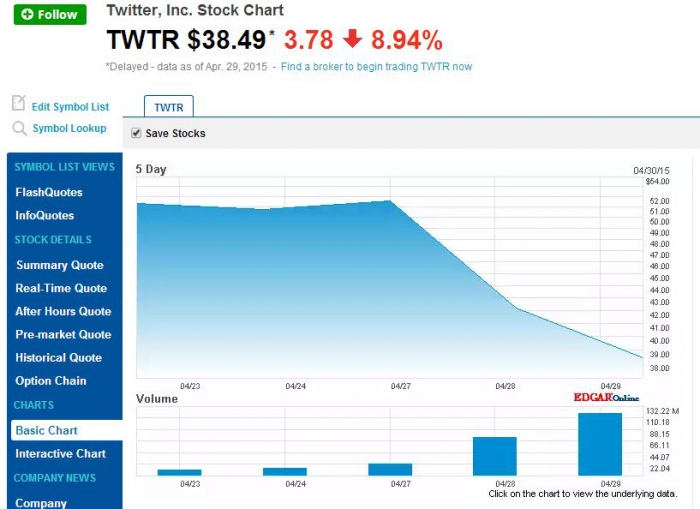 Финансовые результаты Twitter разочаровали инвесторов. За два дня компания потеряла более четверти рыночной стоимости, чему поспособствовала оплошность Nasdaq. Биржа случайно опубликовала квартальный отчет Twitter на принадлежащем ей сайте Shareholder.com во вторник поздно вечером. Об утечке узнала аналитическая компания Selerity, после чего все желающие смогли ознакомиться с результатами. На следующий день торги начались с резкого падения котировок.