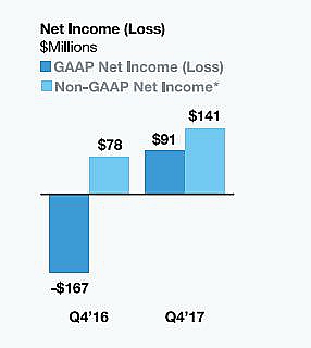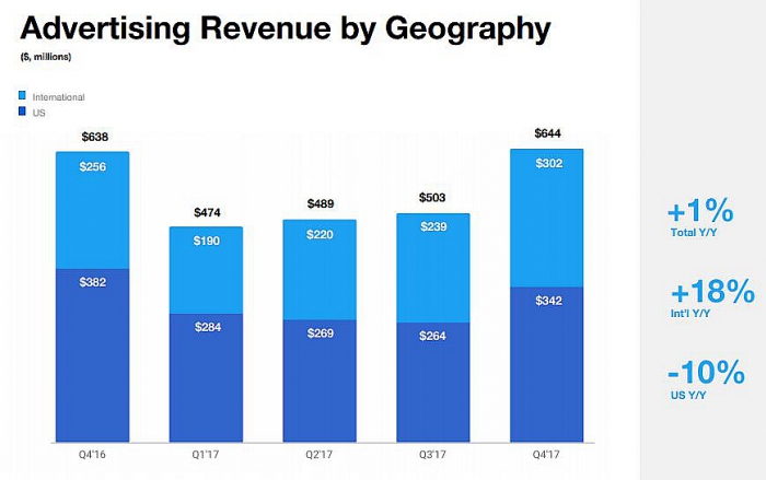 Компания Twitter впервые получила квартальную чистую прибыль (по GAAP). По итогам IV квартала этот показатель составил 91,1 млн долларов. Выручка достигла 732 млн долларов, показав рост на 2% (+8% без учета покупки TellApart). Американский рынок принес компании 406 млн долларов (-8%), международный бизнес — 326 млн долларов (+17%). Продажи рекламы в Twitter увеличились на 1%, до 644 млн долларов.