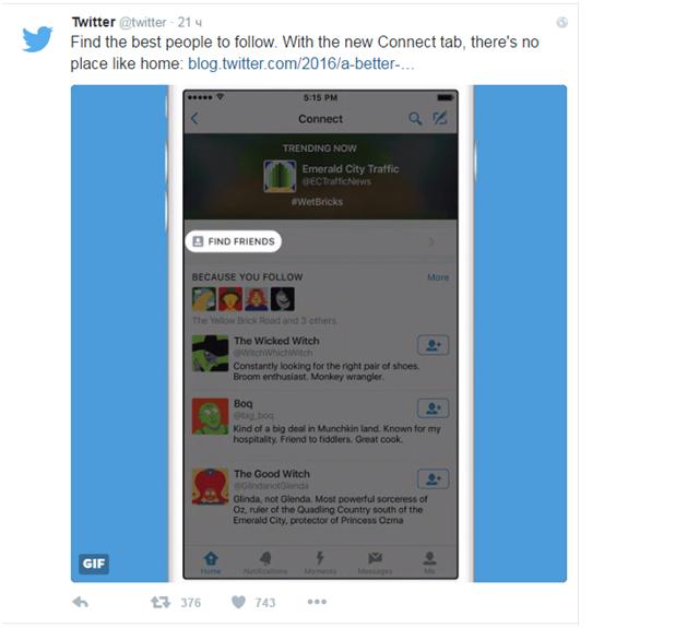 Список рекомендуемых блогов будет отображаться в новой вкладке «На связи» (Connect), а выбор будет основываться на разных факторах - на аккаунтах, на которые пользователь уже подписан, на твитах, которые ему нравятся, на популярных в его регионе блогах, на актуальных событиях, происходящих в мире в этот момент, и т.д. Twitter также будет пояснять, почему рекомендует подписаться именно на эти аккаунты.