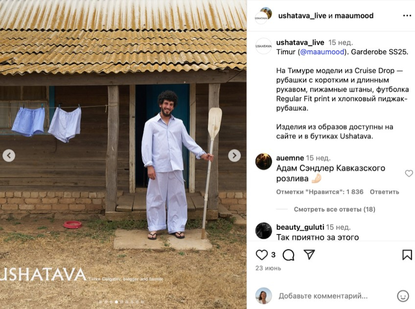 Блогер Тимур Далгатов показывает простую жизнь без агрессивной самопрезентации: его ролики с котиками и козами стали вирусными. В июне 2025 года бренд USHATAVA предложил блогеру выпустить коллаборацию, так как ценности, транслируемые блогером, перекликаются с ценностями модного дома.