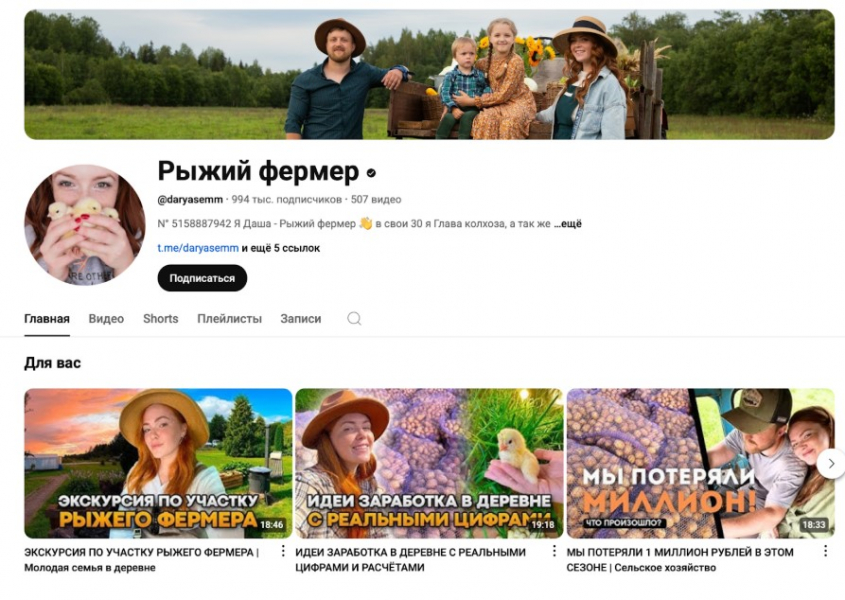 - YouTube канал «Рыжий фермер» — контент, построенный на демонастрации лайфстайла и уходе за огородом, суммарно собрал более миллиона.
