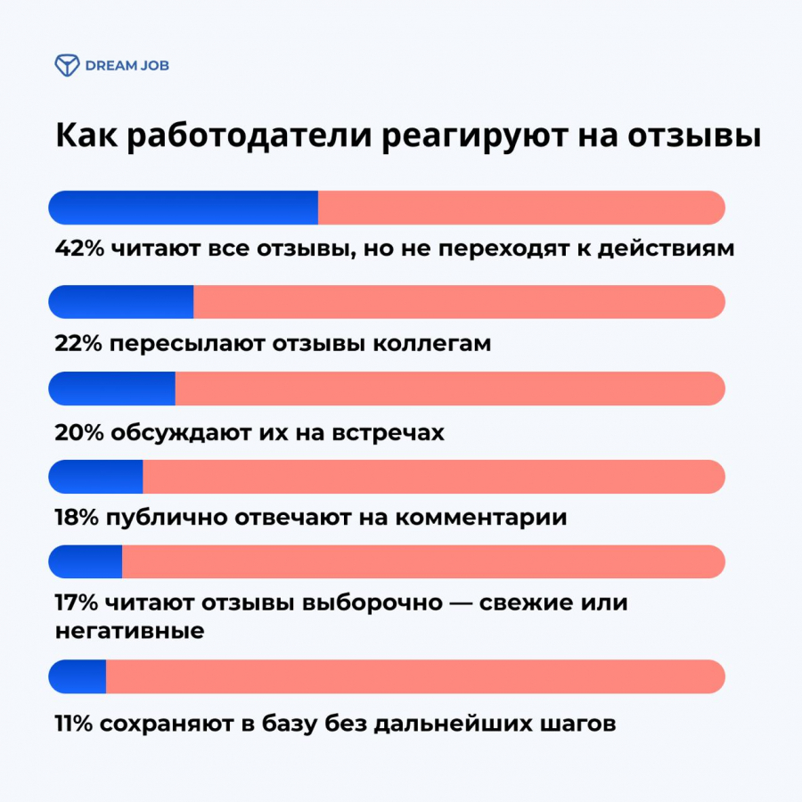 В среднем 42% российских работодателей читают все отзывы, но не переходят к действиям, ограничиваясь пассивным мониторингом. 18% отвечают на комментарии, 22% пересылают их коллегам, 20% обсуждают на встречах. В отдельных случаях отзывы читают выборочно — только свежие или негативные (17%), либо сохраняют в базу без дальнейших шагов (11%). Об этом говорится в исследовании Dream Job, которое есть в распоряжении Sostav.