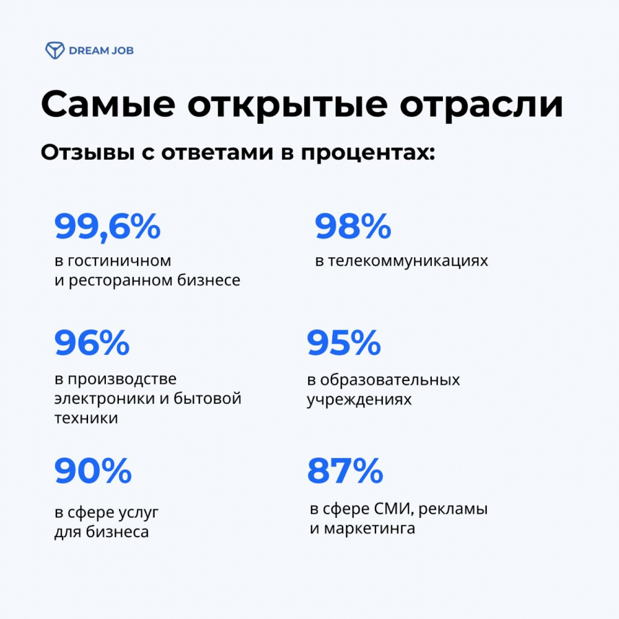 Высокой открытостью и умением выстраивать диалог с кандидатами отличаются компании из сфер гостиничного и ресторанного бизнеса (99,6% отзывов сопровождаются ответом), телекоммуникаций (98%), производства электроники и бытовой техники (96,5%). В список также вошли образовательные учреждения (94,7%) и компании, предоставляющие услуги для бизнеса (90,4%). 87% представителей сферы СМИ, рекламы и маркетинга также активно работают с отзывами. Такая политика помогает им укреплять позиции в борьбе за кадры, повышать доверие и улучшать репутацию.