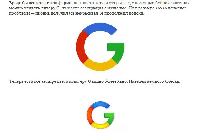 Четырехцветный значок G, который входит в новое семейство логотипов Google, был создан российским дизайнером. Денис Кортунов предложил свой вариант фавикона для поисковика еще в 2008 году. В качестве альтернативы значку, который тогда использовался, он нарисовал литеру G в фирменных цветах. Процесс работы был описан на русском и английском языках на сайте Turbomilk. Позже заметки были удалены, но их копии обнаружило издание Daily Tech.
