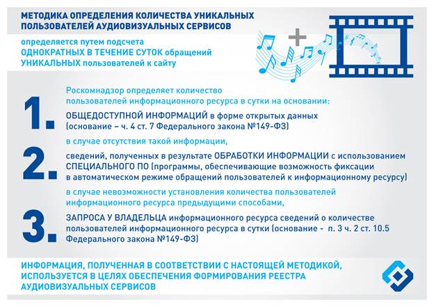 Принятая Роскомнадзором методика подразумевает учет однократных обращений уникальных пользователей к сайту в течение суток, говорится в документе. Ведомство будет определять количество пользователей на основании «общедоступной информации в форме открытых данных» или «в результате обработки информации с использованием специального программного обеспечения». Если это невозможно, Роскомнадзор запросит информацию об аудитории у самого аудиовизуального ресурса.
