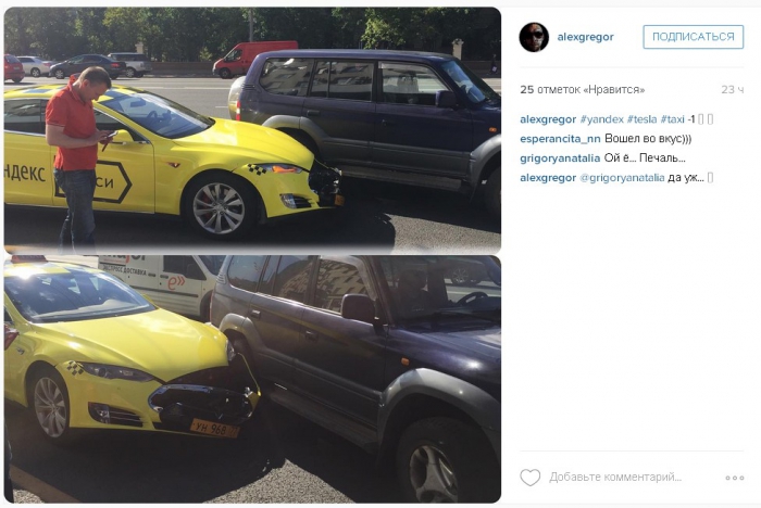 Один из автомобилей Tesla сервиса «Яндекс.Такси» попал в Москве в ДТП. По фотографиям, опубликованным очевидцами в Instagram, видно, что в Tesla врезался внедорожник. В результате столкновения пострадавших нет.