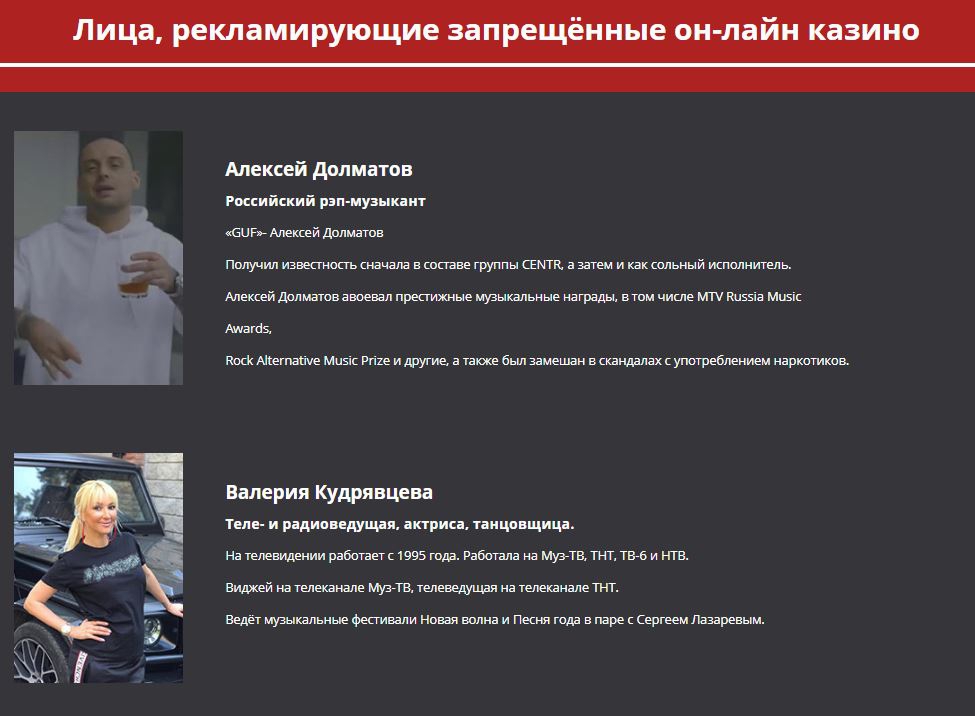 «Из текста, который произносит исполнитель, создаётся впечатление, что участие в основанных на риске играх, является способом заработка. Кроме того, реклама свидетельствует о том, что несмотря на отсутствие высокой должности, лицо, участвующее в розыгрыше конкретного онлайн-казино, может иметь гарантированно высокий доход. Это нарушает пункт 2 статьи 27 закона «О рекламе». Кроме того, ролик содержит утверждения, которые преувеличивают вероятность получения выигрыша и преуменьшают степень риска участия в азартных играх, что также нарушает закон», — заявила глава Молодежного парламента «Парламентской газете».