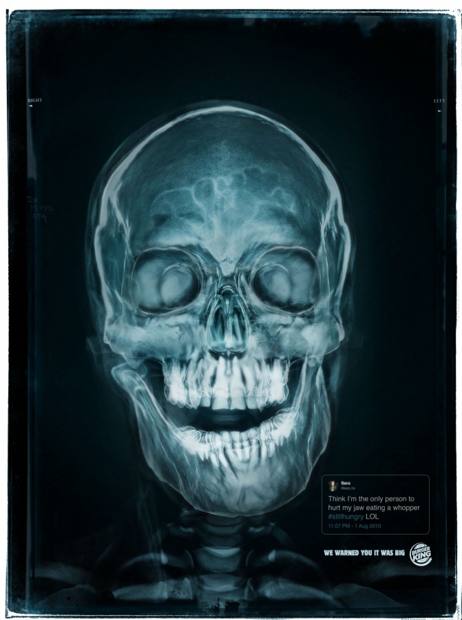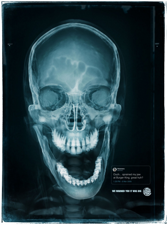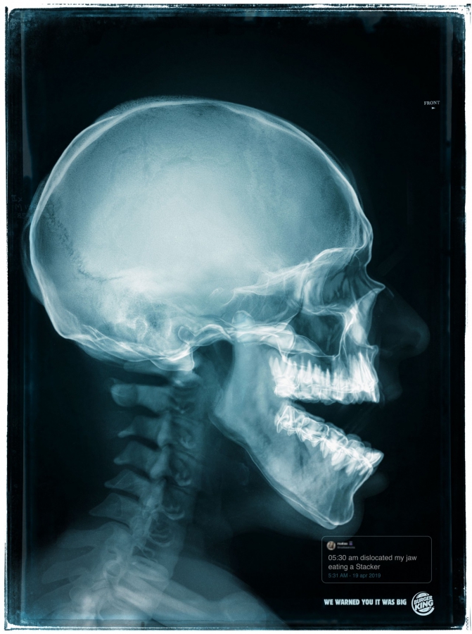 Таким образом Burger King в шутливой форме предупреждает своих посетителей: соблюдайте осторожность, когда будете есть Mega Stacker или Whopper, риск вывихнуть челюсть такой же большой, как и этот сэндвич.