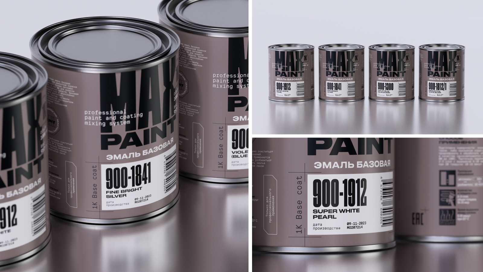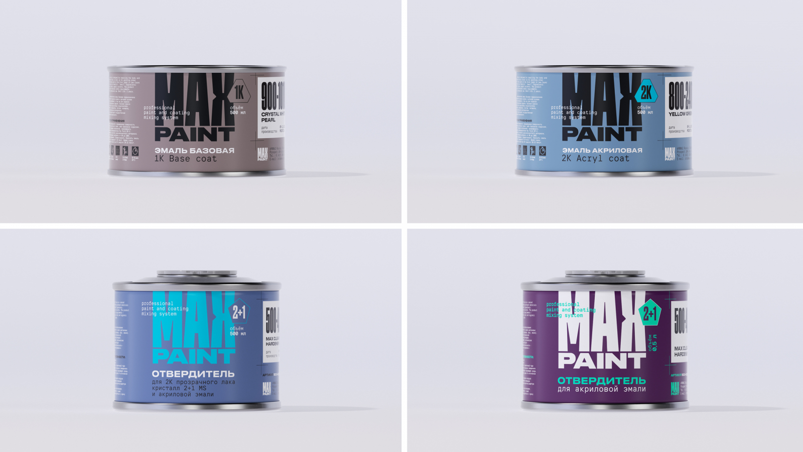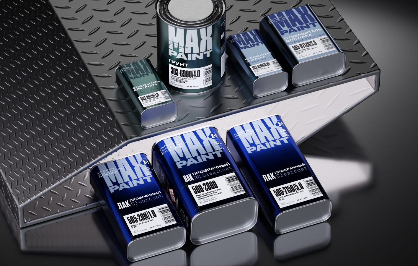 Проанализировав бенчмарки, увидели, что рынок лакокрасочной визуально перегружен. Чтобы выделить Max Paint, мы ушли от декоративной избыточности и выбрали путь в противоположном направлении — чистоты и выверенности. Так родилась минималистичная дизайн-система этикеток, передающая характер бренда. Мы вдохновились средой автосервисов, отказались от лишних деталей в пользу «технической эстетики»: геометрии, строгой типографики, металлических оттенков.