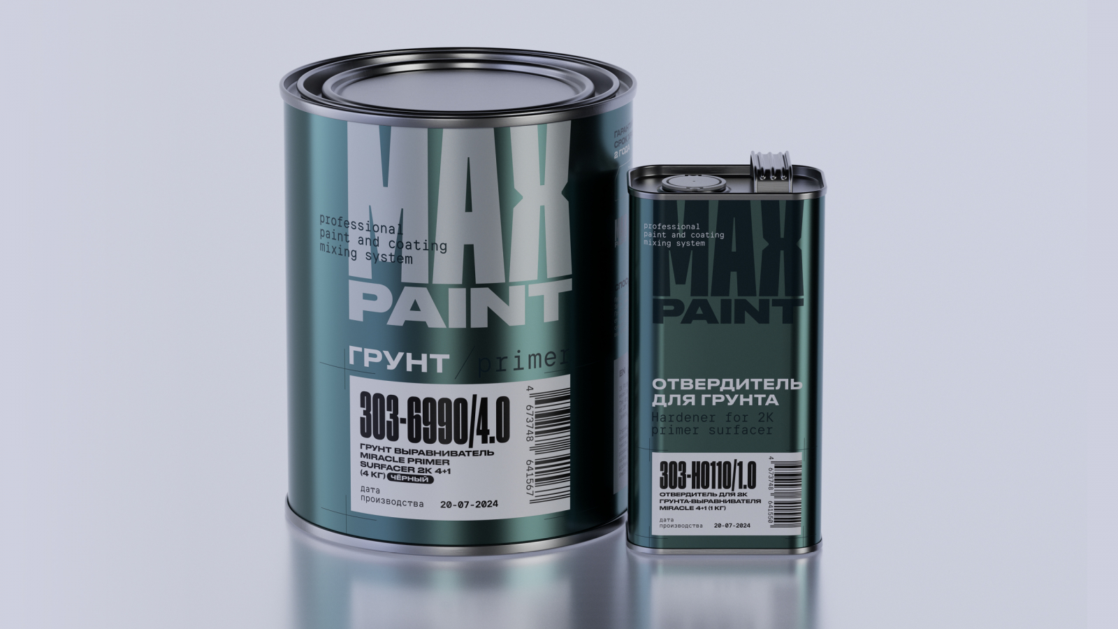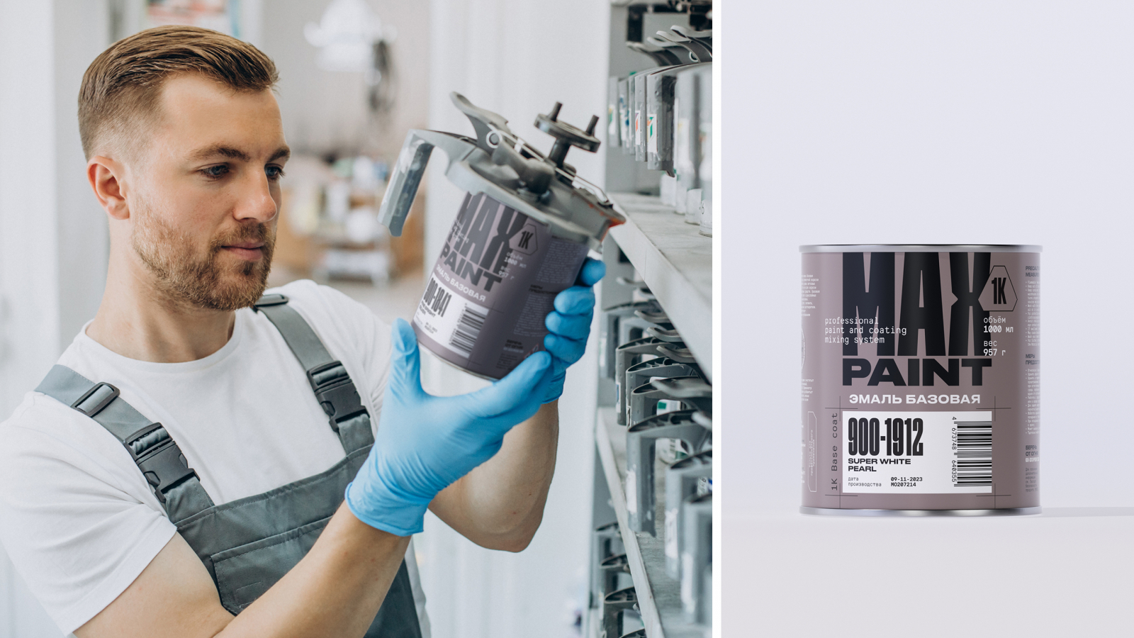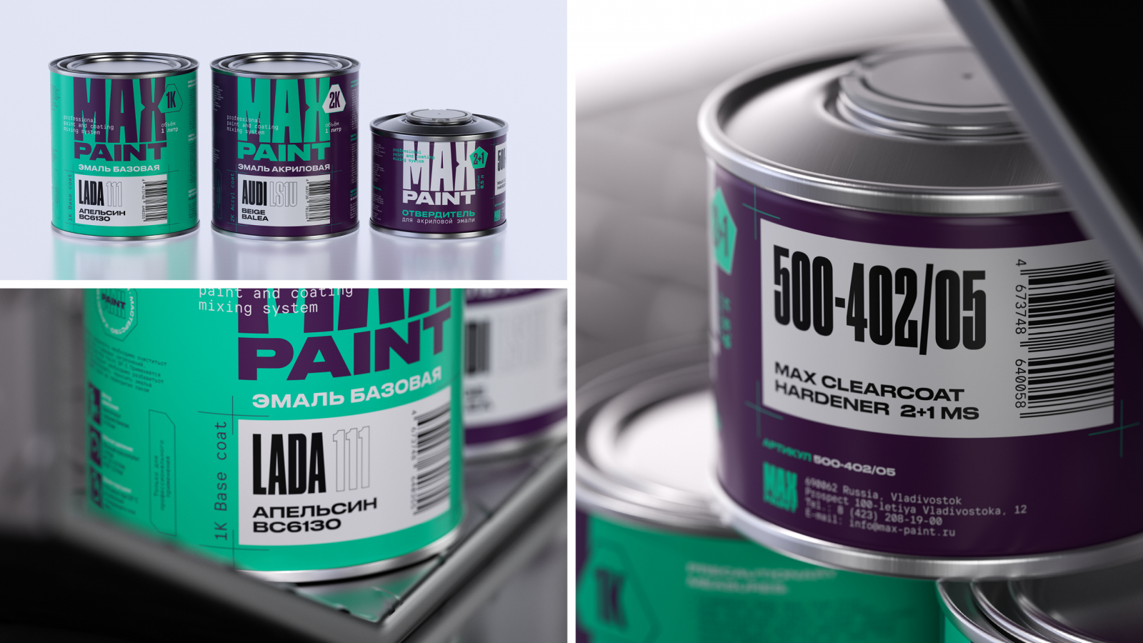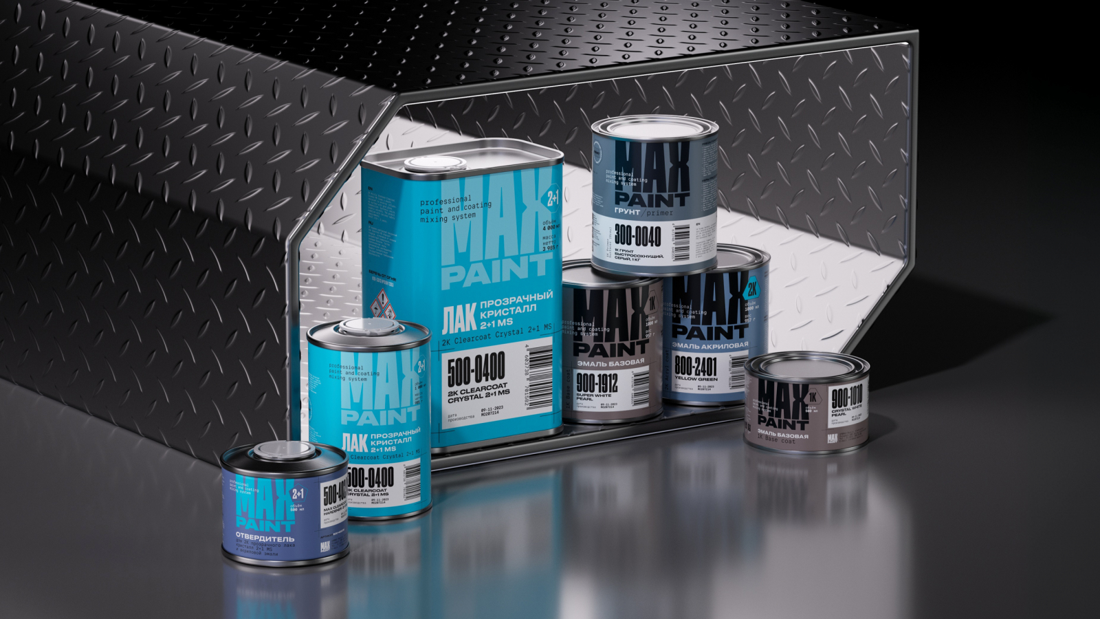 Проанализировав бенчмарки, увидели, что рынок лакокрасочной визуально перегружен. Чтобы выделить Max Paint, мы ушли от декоративной избыточности и выбрали путь в противоположном направлении — чистоты и выверенности. Так родилась минималистичная дизайн-система этикеток, передающая характер бренда. Мы вдохновились средой автосервисов, отказались от лишних деталей в пользу «технической эстетики»: геометрии, строгой типографики, металлических оттенков.