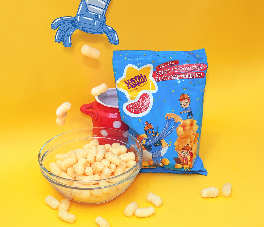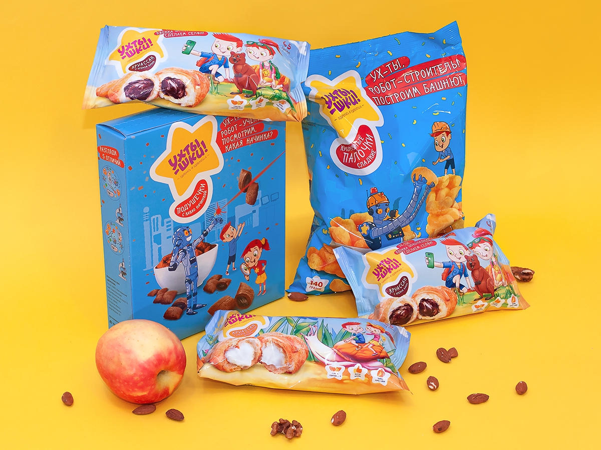 Целевая аудитория «Ухтышек» — дети и родители, поэтому упаковка должна быть яркой, живой и привлекательной, но в то же время информативной, чтобы родители быстро идентифицировали товар на полке и легко считали необходимую информацию.