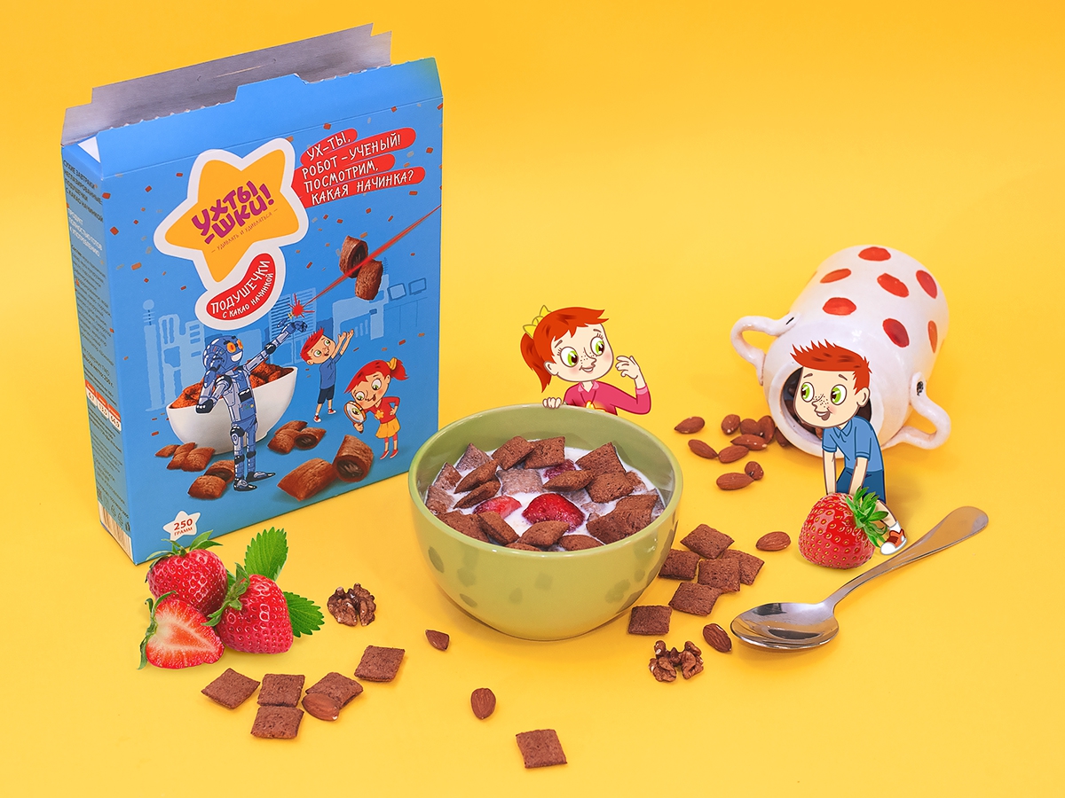 Все чаще крупные торговые сети идут по пути создания и развития собственных СТМ, стараясь изменить восприятие и отношение потребителей к продукции, выпускаемой под этими торговыми марками. Бренд «Ухтышки!» (СТМ торговой сети «Перекресток», включающий в себя сладости, полезные завтраки и товары для детей) обратился в студию