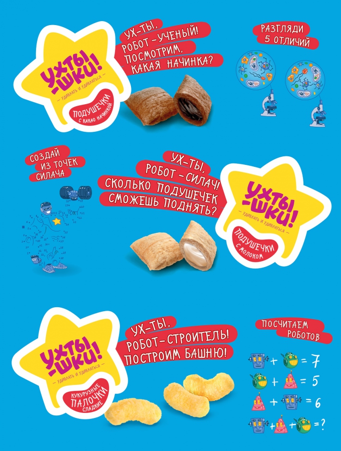 В бренд-зоне каждой упаковки размещена фраза, продолжающая название линейки: «Ух ты!». Креаторы придумали тематические продолжения для каждого сюжета, например, «Ух ты, улитка похожа на круассан, прокатимся!» или «Ух ты, робот-силач! Сколько подушечек поднимешь?». Таким образом, персонажи на упаковке «оживают» и общаются с детьми.