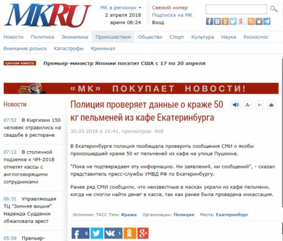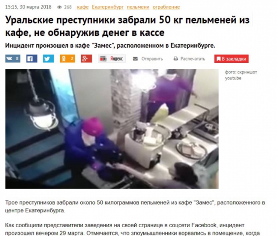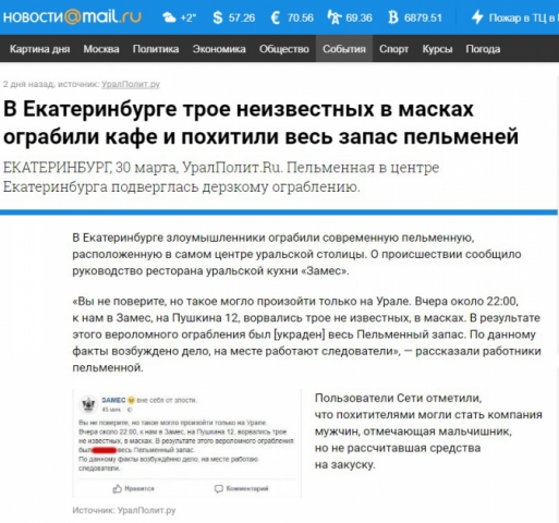 Сообщение о том, что на Урале украли 50 кг пельменей, впервые появилось на одном из телеграм-каналов.