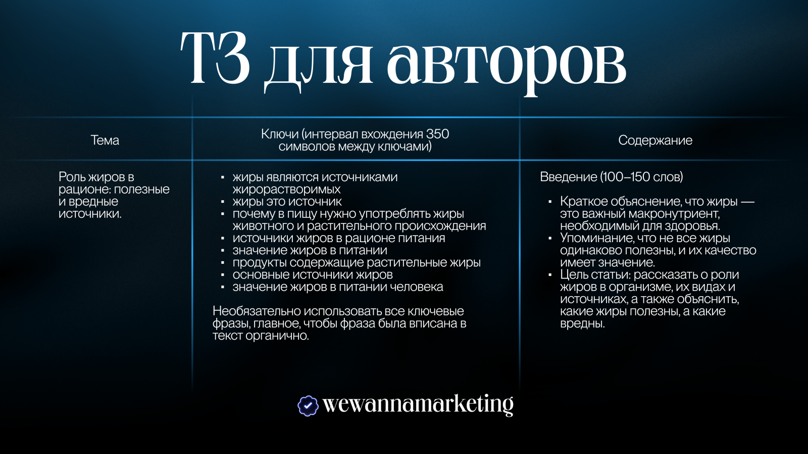 Затем написали ТЗ для авторов с учетом анализа: указали минимальное количество вхождений по ключам, рекомендованный объем текста, заголовки и мета-теги.