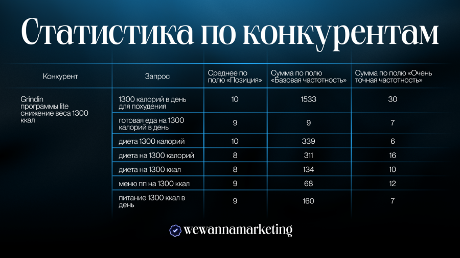 Коммерческие запросы — которые прямо ведут к покупке, например, «москва доставка еды», были собраны не все. Видно, что над семантикой давно не работали. Помимо них, мы добавили еще и информационные, например, «интуитивное питание». Они принесут дополнительный трафик.