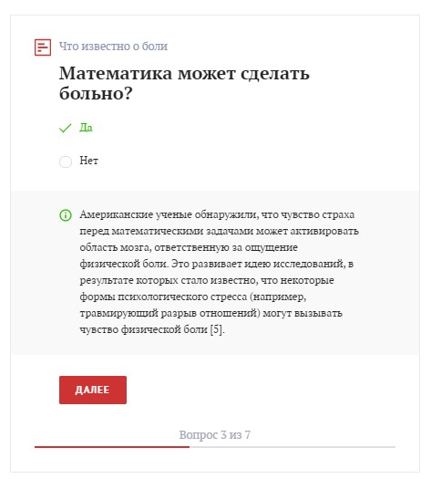 Самой популярной стала статья «Что известно о боли?» (более 16 тыс. просмотров), где пользователям предлагалось пройти тест на знание различных фактов о боли — например, eсть ли люди, которые не испытывают боль и могут ли ягоды помочь уменьшить боль?