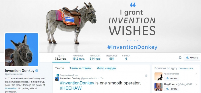 General Electric и BBDO New York запустили онлайн-кампанию, главным героем которой стал изобретательный осёл. Миниатюрное животное исполняет любые желания, но все же предпочитает масштабные задачи. Например, обеспечить энергией всю планету. Кампания охватит социальные медиа: Twitter, YouTube, Facebook и SnapChat.