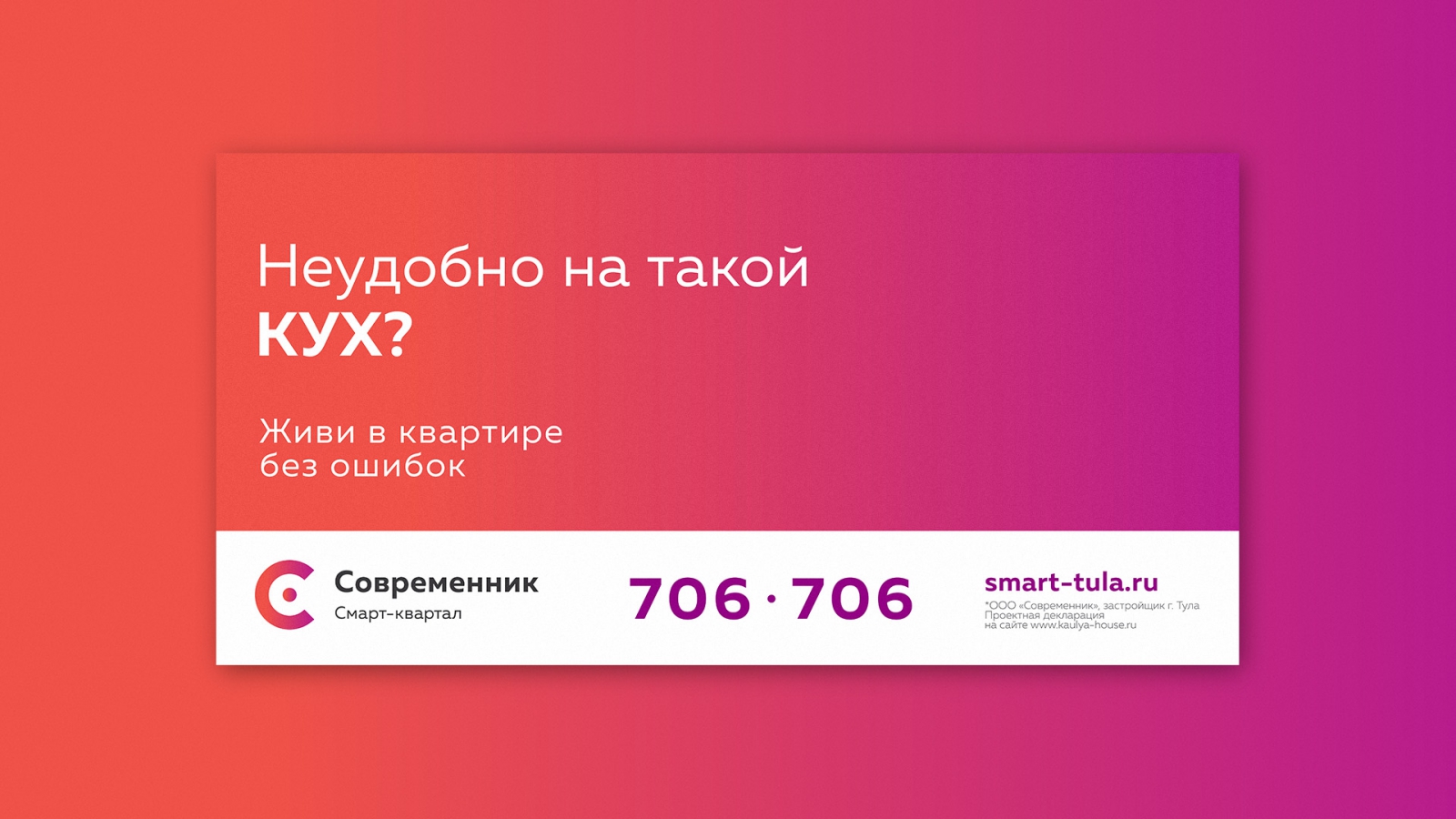 В серии вдохновляющих принтов для наружной рекламы «Соль» продемонстрировала недостатки обычных планировок, которых уже не встретишь в квартирах ЖК «Современник» и призвала жить в квартире без ошибок. В этих лаконичных работах, основанных на тексте, остроумно обыгрываются недостатки «неправильных» квартир. Например, проблема малогабаритной кухни передана фразой «Неудобно на такой КУХ?»