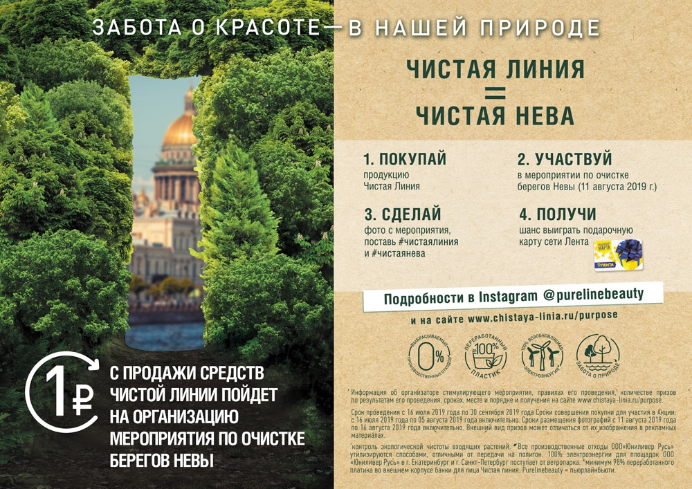 С 16 июля по 5 августа 2019 года в торговых центрах «Лента» в Санкт-Петербурге пройдет экологическая акция: по 1 рублю с покупки товаров бренда «Чистая Линия» будет перечислено на организацию мероприятия по очистке берегов реки Невы.