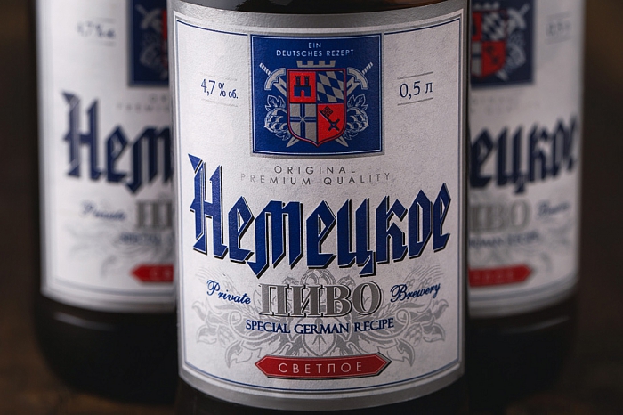 Еще один пивной вывело на рынок агентство Fabula Branding. Упаковка нового бренда «Немецкое» (принадлежит ООО «Варница») включает геральдическую плашку, представляющую сборный образ из элементов региональной немецкой геральдики с добавлением изображения шишек хмеля. Кириллический шрифт логотипа разработан на основе немецкой готики. Цветовая палитра линейки соответствует классическим сочетаниям, используемым в оформлении этикеток пива в Германии.