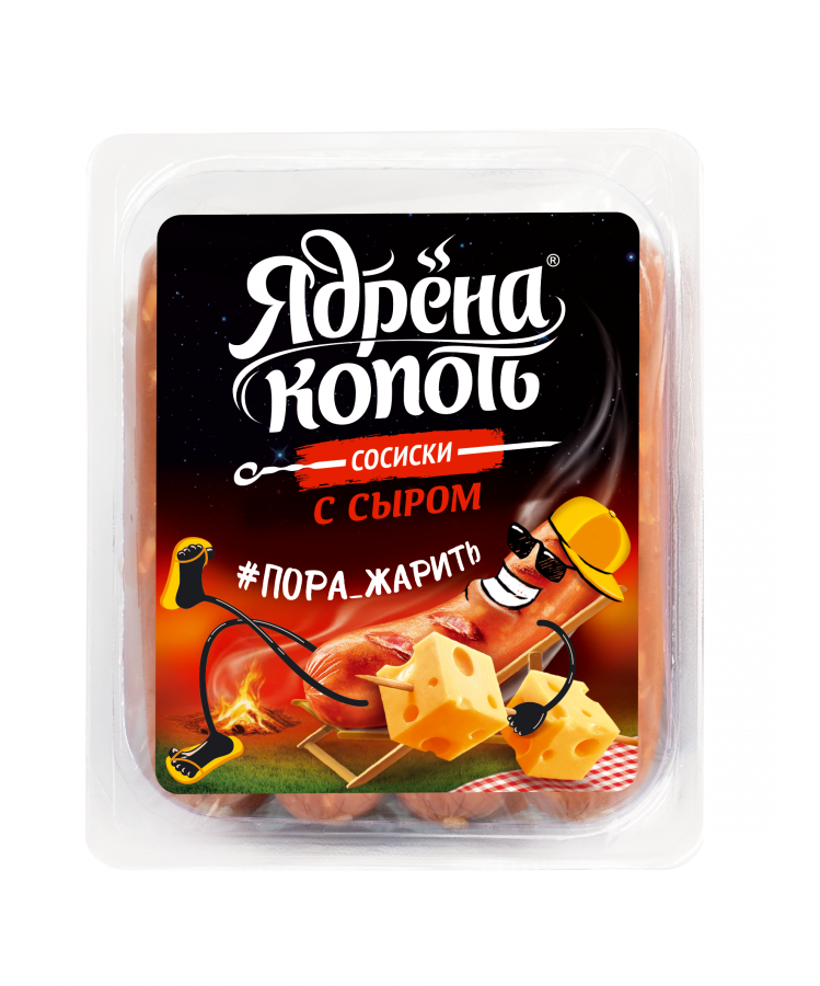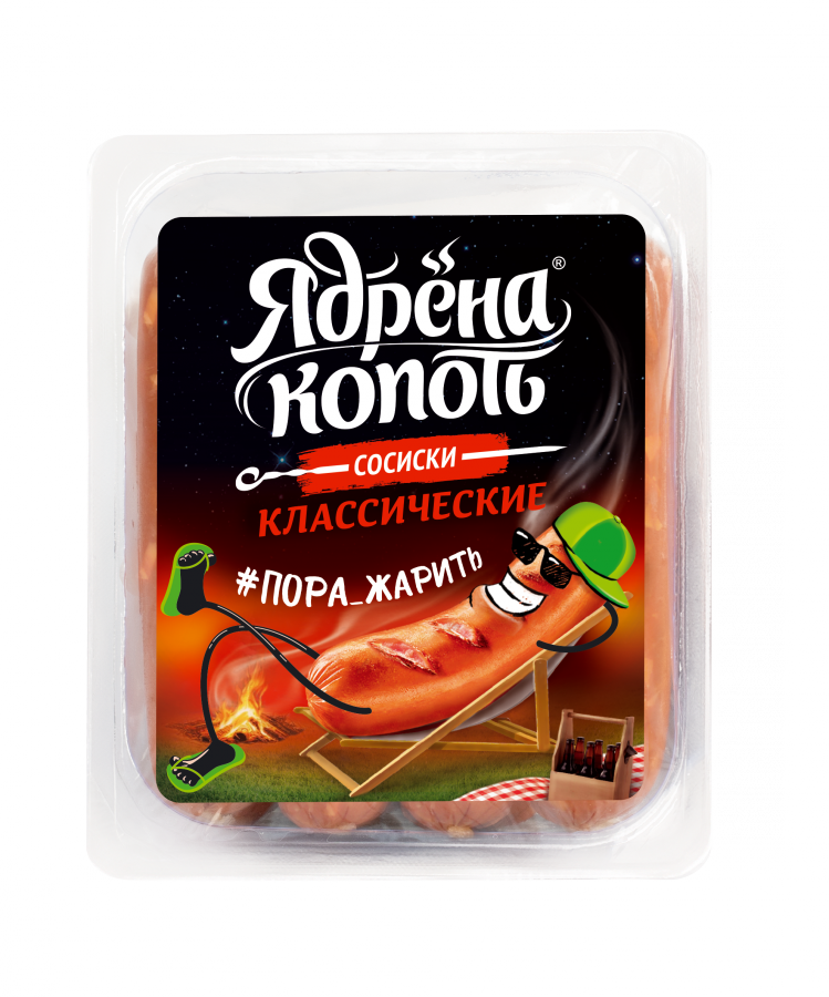 Летняя коммуникация размещена на упаковках двух самых популярных позиций бренда «Ядрёна копоть»: сосисках «Классические» и «С сыром». Для сезонной коммуникации была выбрана история про пикник — настоящий летний вид отдыха. Обновленный дизайн этикетки представляет пикникового героя, сидящего у костра на шезлонге. Хэштег #пора_жарить усиливает общий посыл — с продуктами «Ядрёна копоть» можно устроить пикник на скорую руку, когда и где угодно, независимо от обстоятельств.