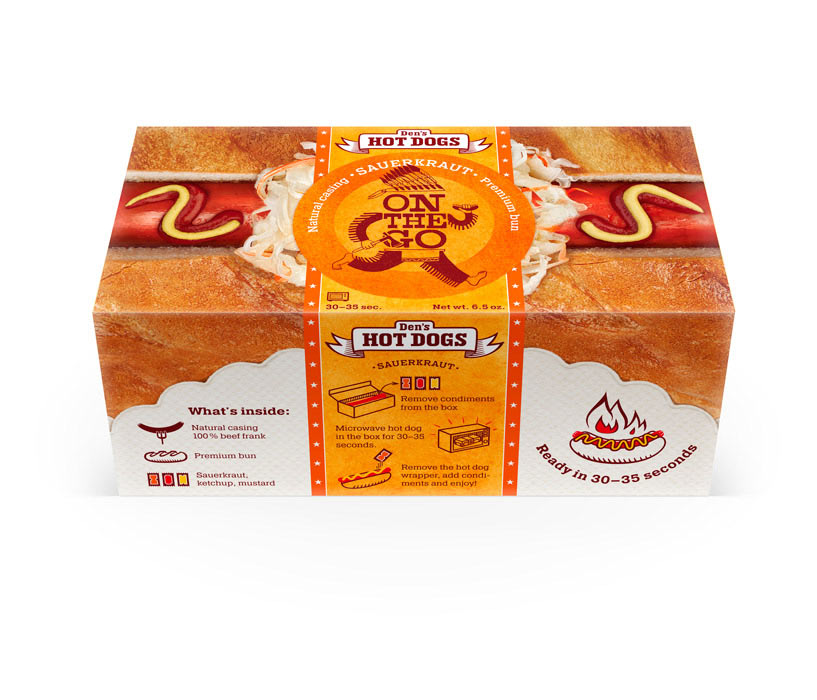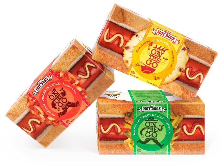 Компания Den's Hot Dogs под маркой On the Go выпускает в США готовые хот-доги, которые перед употреблением достаточно просто разогреть в микроволновке. В Студии было оформлено название компании и упаковка продукции, а также придуманы персонажи, символизирующие марку.