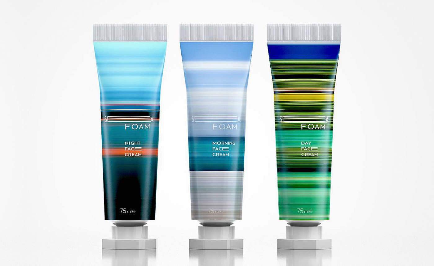Я делала упаковку для отдыха. Мой продукт — это отдых на море. Буквально растягивая изображения утреннего, дневного и вечернего морского пейзажа, был получен дизайн серии упаковок «Sea Foam». Это визуализация фразы «растянуть удовольствие».