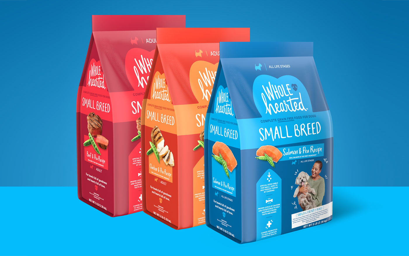 А Bulldog Drammond, наоборот, сделало ставку на фотоизображения и эмоциональную связь, которая так близка и дорога заводчикам домашних животных мелких пород. В дизайне линейки полезного для здоровья корма Small Breed от WholeHearted они сделали все возможное, чтобы передать эту сильную любовь, и добавили дополнительные элементы иллюстраций по всему набору, чтобы передать чувство веселья и радости.