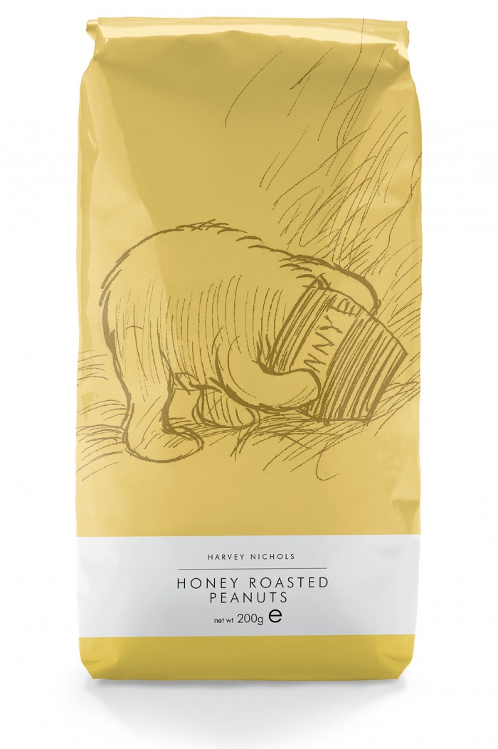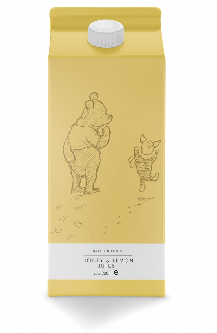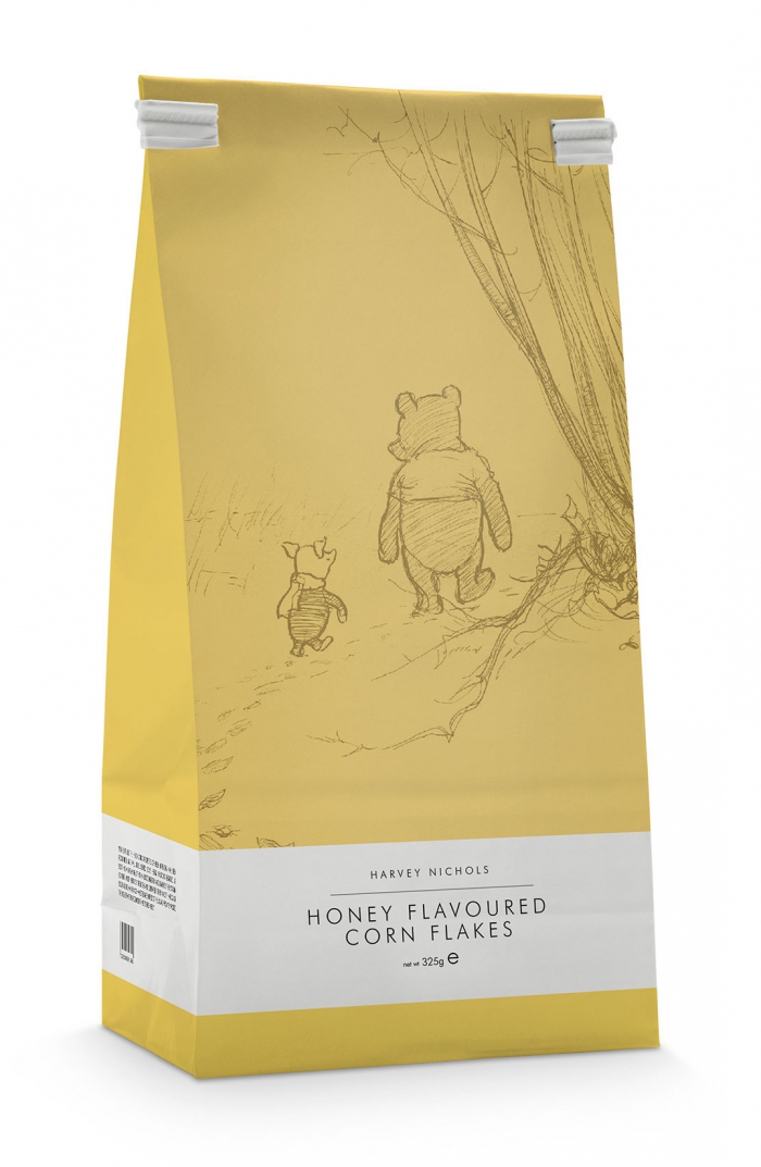 Британский дизайнер Майкл Мара создал упаковку для трех новых медовых продуктов торговой сети Harvey Nichols (хлопья, сок и арахис). В дизайне креатор задействовал двух главных героев мультика «Приключения Винни Пуха» студии Disney, изобразив их в стиле карандашных набросков. Для самой упаковки дизайнер выбрал однотонный желтый цвет, соответствующий ее медовому «содержанию».
