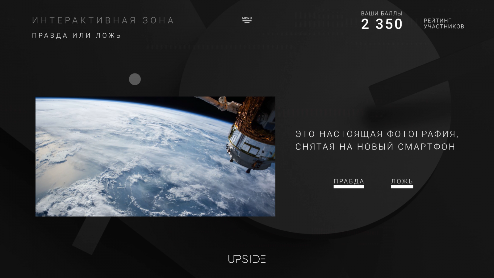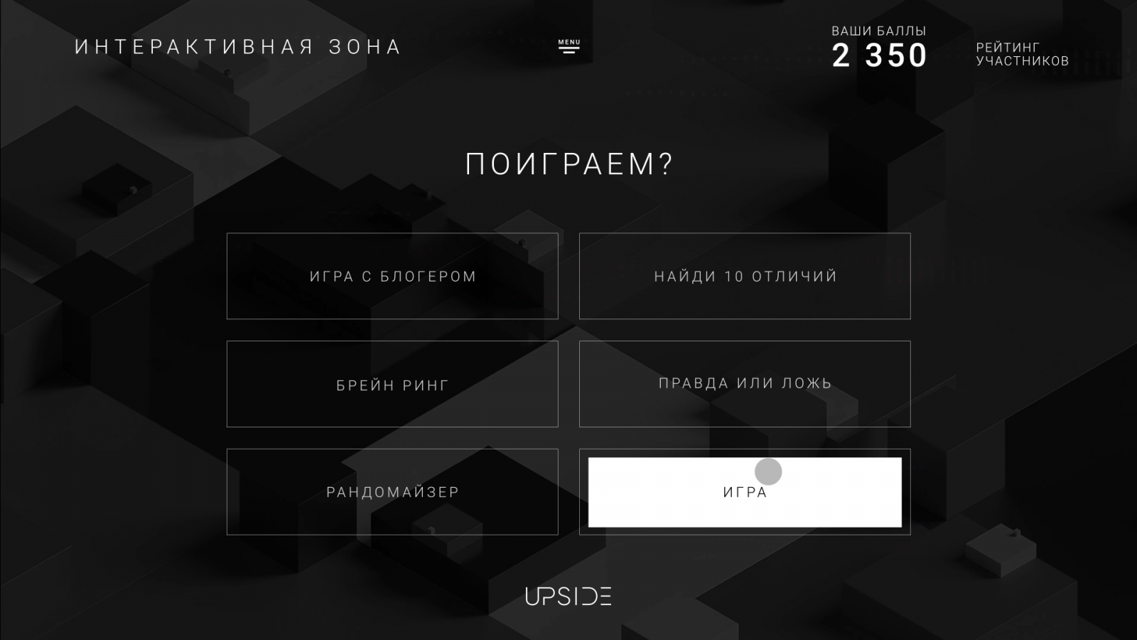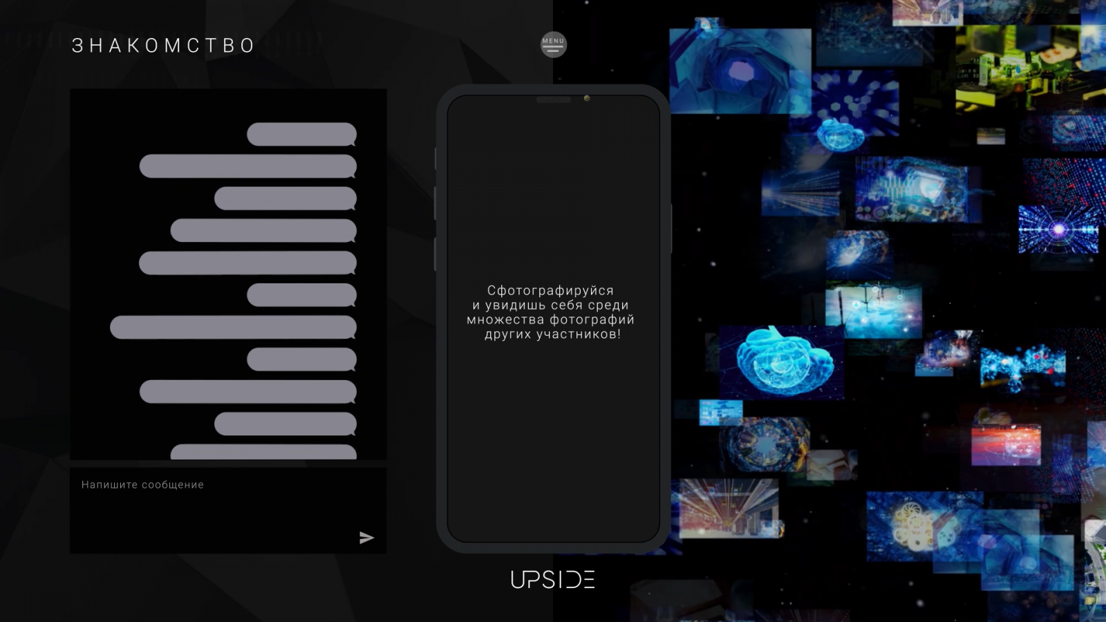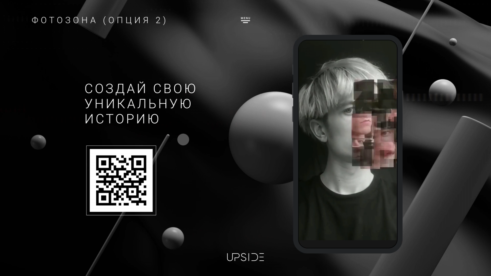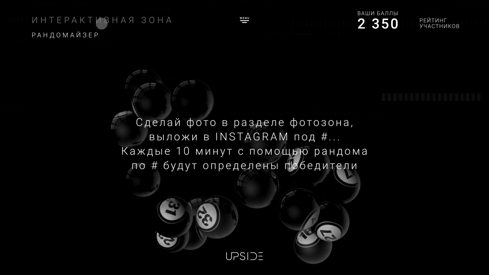 Upside представляет собой прототип, в котором агрегированы все опции офлайн-мероприятия. Для каждого проекта разрабатывается своя концепция, структура, наполнение, визуальное оформление, интерактивные зоны — всё для полного погружения гостей в атмосферу мероприятия и создания реалистичных эмоций.