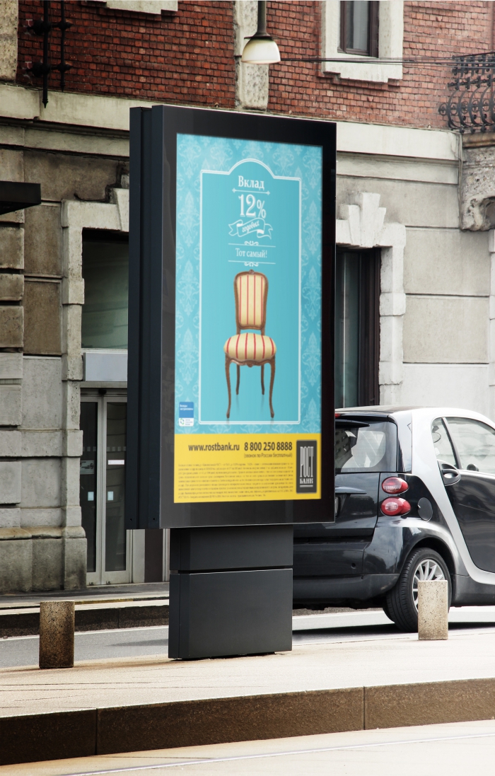 По словам креаторов, ставка в 12% связана с аналогией двенадцати стульев. Визуальная составляющая иллюстраций показывает единственный объект – легендарный стул, который призван продемонстрировать клиенту, что банк готов предоставить клиенту «тот самый» способ быстрого обогащения и надежного хранения.