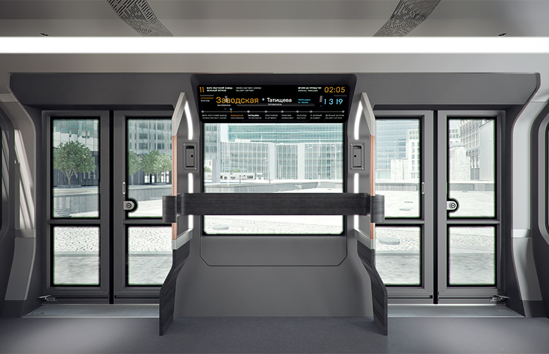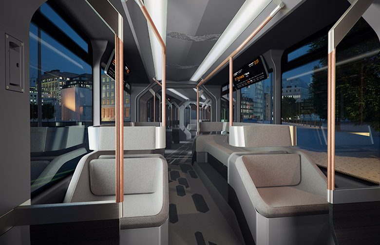 При отделке салона используется дерево, металл и сукно, которые должны подчеркнуть русскую самобытность. Внутри трамвая — удобные эргономичные кресла и антибактериальные поручни с медным оттенком. Акустическая система позволяет включать специально подобранные подкасты легкой инструментальной музыки, энергичной в первой половине дня и успокаивающей вечером.