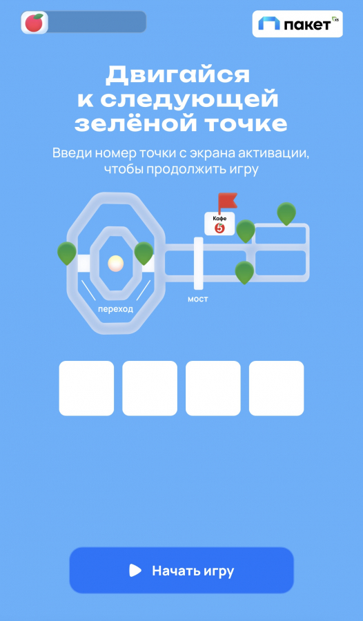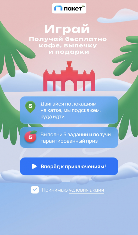 Для вовлечения посетителей мы задействовали интерактивные стелы на территории катка. Посетители сканировали QR-код на стеле и получали доступ к квесту: в телефоне открывался смоделированный каток в формате виртуальной карты с отображением всех пяти стел. В ходе квеста необходимо было поочерёдно передвигаться к каждой из них и сыграть в пять игр с простыми механиками, которые знакомят игроков с преимуществами «Пакета» от Х5.