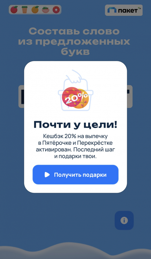 Специальные промокоды позволяли идентифицировать пользователя и учесть накопленный результат. После успешного завершения квеста игрок по QR-коду мог получить бесплатные кофе, выпечку и мерч от сервиса «Пакет» от Х5.
