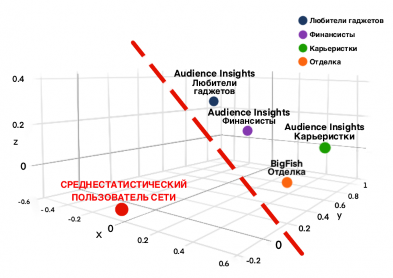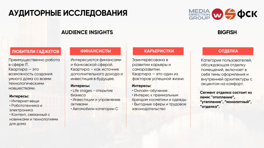 С помощью инструмента для создания кастомных аудиторных сегментов MoonFish и на основе полученной аналитики были выбраны и построены четыре новых для бренда аудиторных сегмента: «Любители гаджетов», «Финансисты», «Карьеристки» и «Отделка» с такими соцдем параметрами: женщины и мужчины от 25 до 55 лет с доходом выше среднего и геотегом — Москва и Московская область.