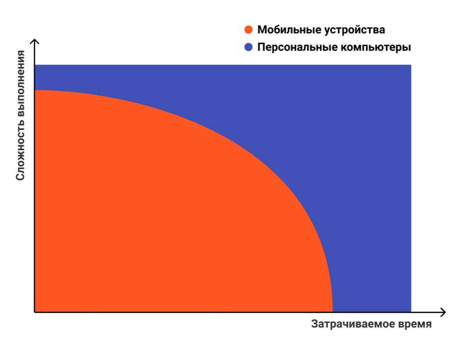 - Стоит также понимать, что между временем, затрачиваемым на выполнение задачи, и устройством, с которого пользователь планирует взаимодействовать с сайтом, есть прямая корреляция. В большинстве случаев пользователи предпочитают стационарные компьютеры для сложных или длинных по времени задач, а для более простых чаще всего используют мобильные устройства.