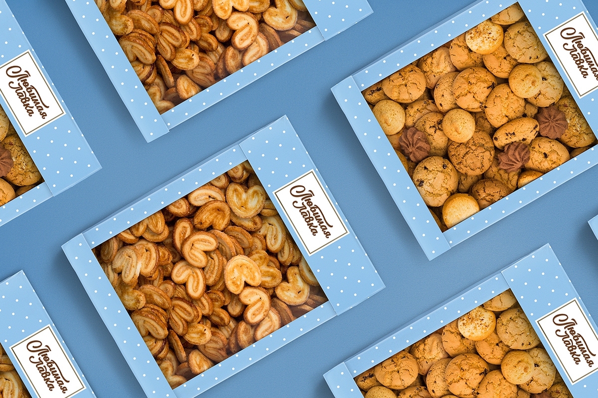 Логотип — леттеринг шоколадного цвета — отсылает потребителя к образу уютной кондитерской. Паттерн-горошек на фоне мягкого голубого оттенка, использующийся как в дизайне интерьера, так и на коробках для сладостей, настраивает на эмоциональную теплоту.