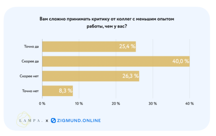 Почти 70% участников опроса отмечают, что им сложно принимать критику от коллег с меньшим опытом работы. А 56,4% согласились с тем, что в коллективе всегда присутствует человек, общение с которым дается очень нелегко.