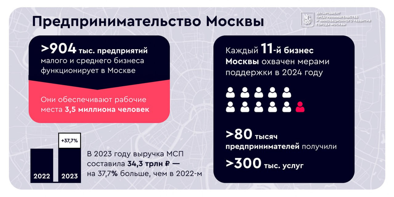 В Москве насчитывается более 904 тыс. предприятий малого и среднего бизнеса, обеспечивающих четверть всех налоговых поступлений и создающих рабочие места для 3,5 млн человек.