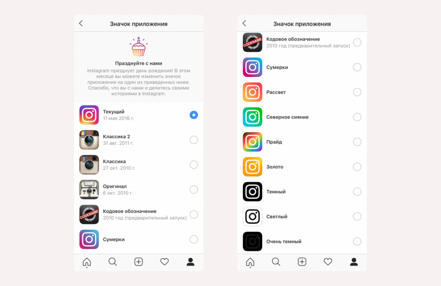 Instagram подготовила пользователям пасхалку в честь своего десятилетия. В приложении можно заменить стандартный значок на ретро-иконку с полароидом или выбрать другие цветовые решения для текущей картинки.