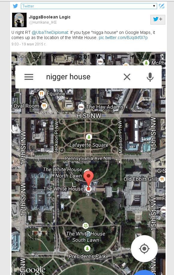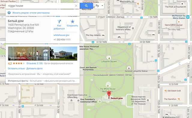Картографический сервис Google Maps по запросу "nigga house" выдает информацию об американском Белом доме, сообщает Venture Beat. Запрос работает как в веб-версии, так и в мобильном приложении сервиса. Первые упоминания о Белом доме, как о "nigga house" в Google Maps датируются 19 мая.